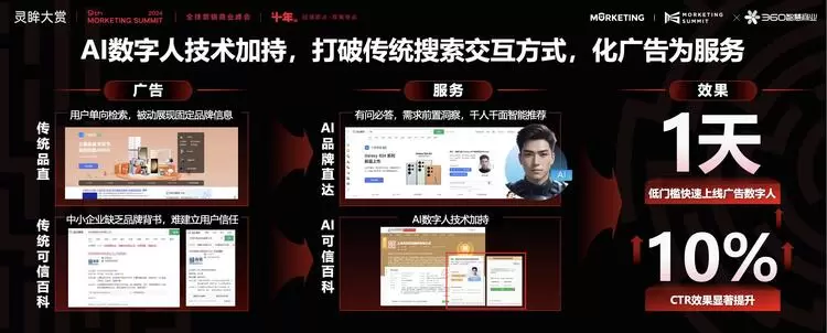 360AI广告产品打破传统搜索交互方式,化广告为服务。通过在传统广告中加入AI数字人互动区提升了用户体验。AI品直的双向互动、AI可信百科的权威信息查询,均显著提升了广告点击率,为企业投放带来更高回报。