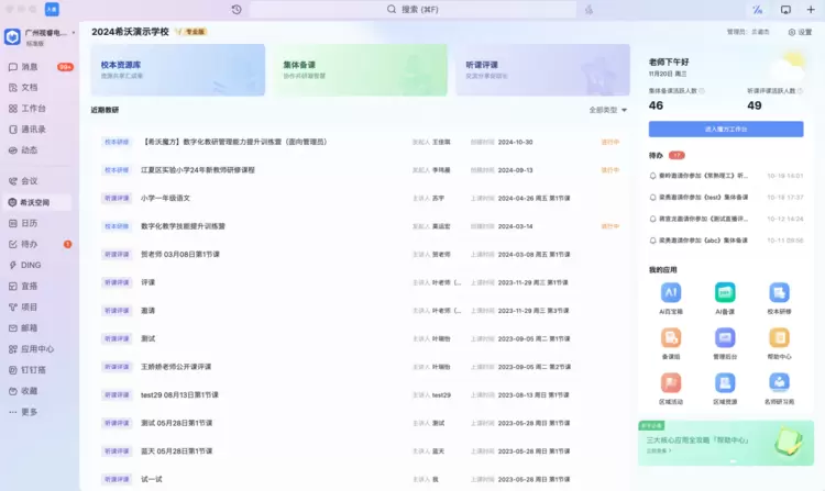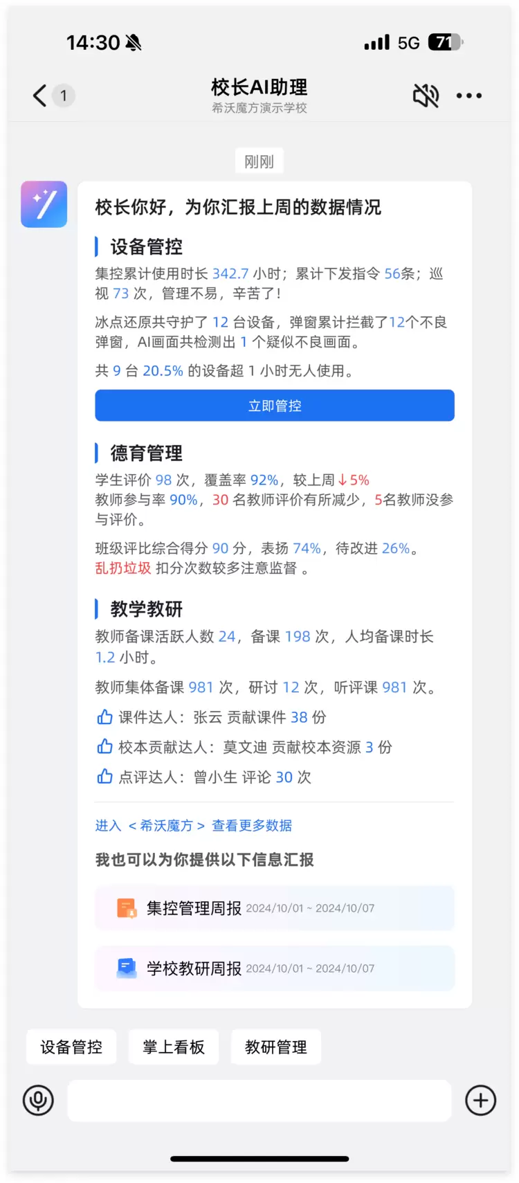 目前,双方已经实现产品场景融合方案的初步落地,为校方管理者、一线教职工提供1+1>2的智慧教育体验。校长主任无需多设备App来回切换,只需通过钉钉“AI助理”一个入口,即可获取专属教研、评价与管理数据变化周报,辅助校园动态决策。信息化管理员无需现场巡查、手动统计,即可通过可视化报表,随时了解交互智能平板等设备使用与达标情况,筛查设备异常状态。对于一线教师来说,集成后的新系统大大简化了繁琐、零碎的教学事务,老师可直接通过钉钉侧边栏,一站式访问白板课件资源,完成集体备课、听评课等日常教学操作,实现教学资源共研共享。
