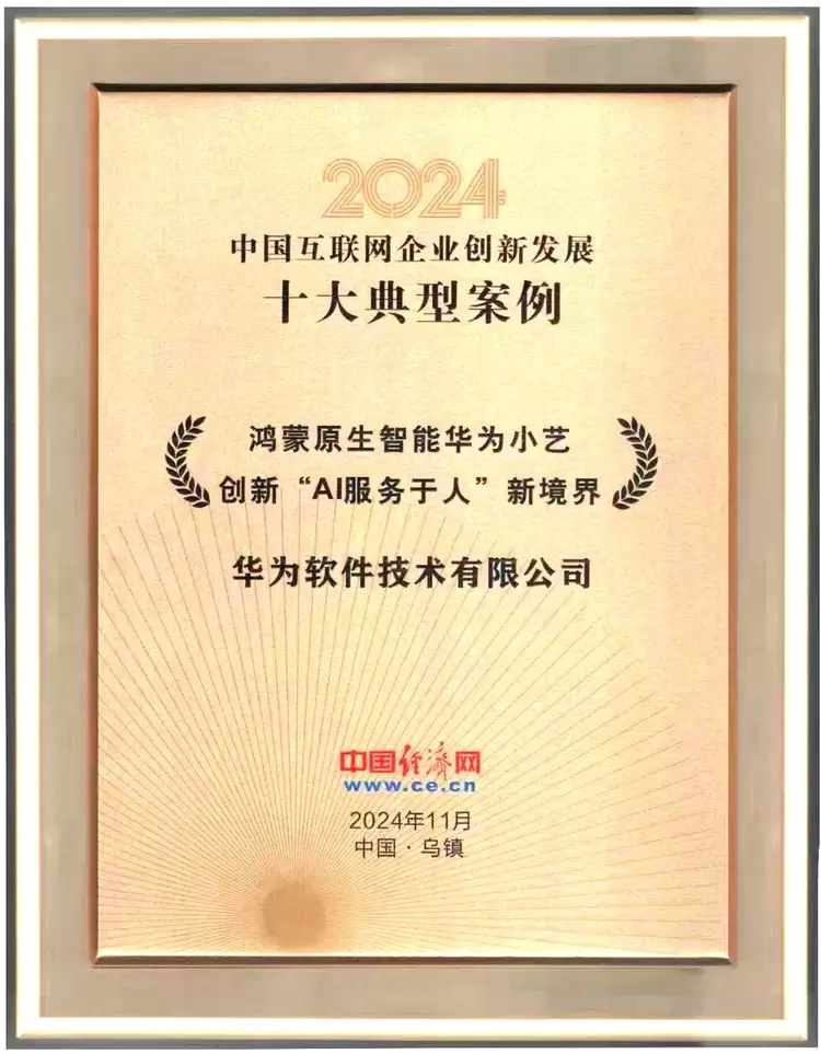 华为小艺获评“2024年度中国互联网企业创新发展十大典型案例”