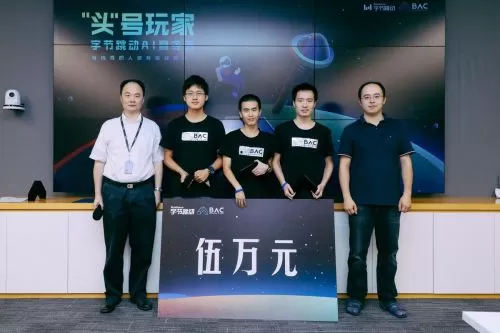 (字节跳动副总裁杨震原和人工智能实验室科学家李航为一等奖获奖小组学员颁奖)