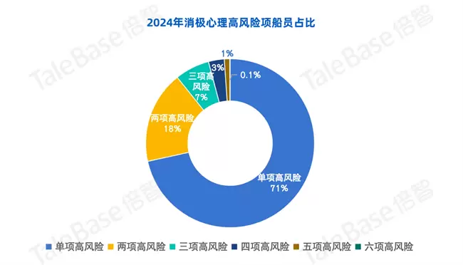 有多项消极心理因素同时为高风险的船员较少,6项消极心理因素均为“高风险”的船员占比低于1%,但同时有多项积极心理因素不足的船员约为40%,说明船员整体较少存在比较极端的消极心理风险,但他们在积极心理因素的提升上有较大的发展空间,通过针对性的积极心理因素提升,补充心理动能,让他们有更多的积极心理去调节和消化消极心理,进一步减少由于极端消极心理状态可能导致的不良事件的风险。
