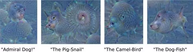 在不同的层次输入图片会得出不同的结果,比如在一些测试中,就出现了这些多眼多足的“神兽”。