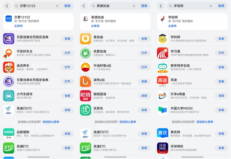 升级HarmonyOS NEXT公测版这一个多月以来,最大的感受就是原生鸿蒙上的应用和服务覆盖越来越完善了!目前已上架的15000多款鸿蒙原生应用及元服务能够满足我们绝大部分的使用需求,而像是交管12123、易捷加油、学信网,以及部分省级政务服务平台等暂时还没上架的应用,在鸿蒙原生应用市场中搜索时也会提示可以使用支付宝提供的服务,点击“去使用”就能直达对应小程序。