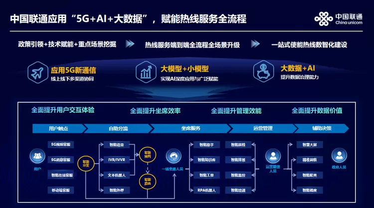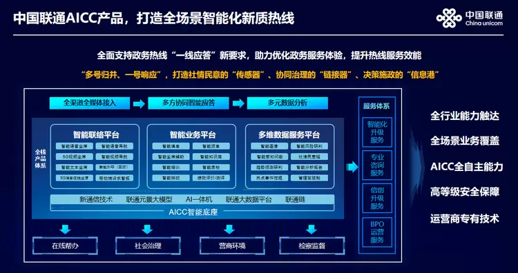作为政府与民众之间的桥梁和纽带,市民热线承载着大量的民生诉求和公共服务需求。强化热线功能,打造便捷、高效、规范、智慧的政务服务“总客服”,是推进“一线应答”的基础保障,也是推动“高效办成一件事”的重要手段之一。当前政务热线发展在多元化服务建设、业务诉求办理、应用智能化、为企服务效能等方面仍需提升与优化。围绕这一挑战和需求,中国联通聚焦热线服务重点场景和关键环节,立足“5G新通信+AI+大数据”数字技术融合创新,构建了以AICC智能底座为基础的“全媒体智能话务平台+智能热线业务平台+多维度数据服务平台”一体化智能热线产品,赋能热线服务全流程,为用户提供便捷、多样的服务渠道,为坐席提供好用、易用的系统能力,全面支持政务热线“一线应答”新要求。