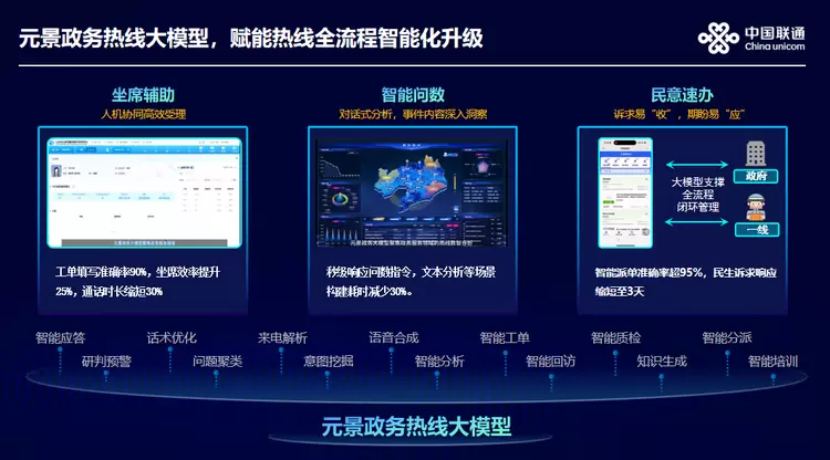 算力是智能客服平台落地的基础,便捷高效,高性价比的算力是智能化场景规模化落地的前提。针对平台建设中的智算算力问题,中国联通发布了基于昇腾底座的“元景政务一体机”,将大模型服务能力软硬件一体化集成,通过市民热线为城市跨域协同治理、城市科学决策、城市精细治理等提供新动能。通过软硬件结合方式,将算力和算法高效整合,全面赋能智能工单填报、智能派单、坐席知识辅助、热线数智分析和智能问答等应用场景。该一体机采用优化了推理训练框架,从而以更高的性价比支持大规模智能化政务应用。