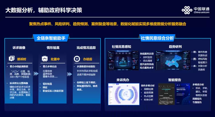 依托中国联通在智能热线领域的实践经验与技术积累,聚焦数智链结合,整合“大数据、人工智能、区块链”等能力,对热线数据进行横宽纵深的数据分析及数据挖掘,为客户提供大屏+应用+报告等多形态的服务形式,为政务热线建设提供贴身、专业的服务支撑,推动热线诉求从接诉即办向未诉先办转型。