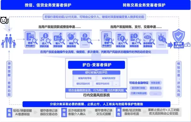 ● 事中保护更全面:“护白”模型精准识别被诈骗用户风险状态,辅助金融机构及时采取保护性措施避免财损坏账,守护人民“钱袋子”安全,发扬消费者保护与企业社会责任。