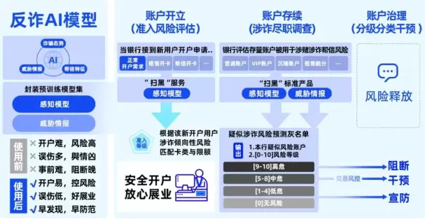 ● 事前尽调更精准:“扫黑”模型事前预测账户开立涉诈倾向与存续潜伏帮信风险,实现精准高效的准入尽职调查和交易风控决策,以更少误伤有效阻断更多异常账户可疑交易。