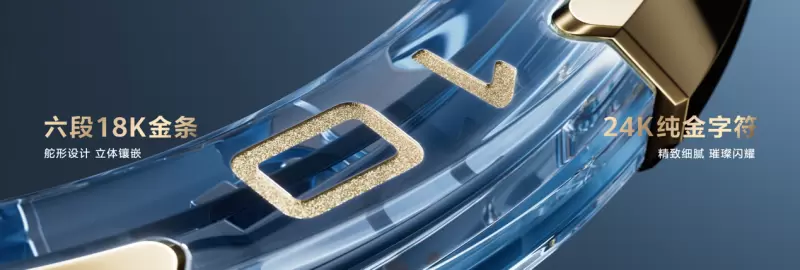 细节处理上更显精细匠心,华为通过皮秒级激光技术在坚硬的蓝宝石水晶表圈上镭雕出凹刻字符,并结合现代真空离子镀膜工艺,打造出24K纯金字符,呈现出独特的金砂纹效果,精致细腻,质感非凡。