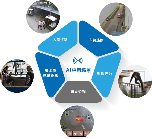 智慧安防:人员密度,男性进入女宿舍识别,多人打架识别,缺失识别,天台人员识别,特殊动作求救识别,危险区域入侵识别,危险行为识别,人群聚集,持械等风险行为。绊线入侵,区域入侵,烟火检测,电动车检测,垃圾检翻墙检测,越界检测,火焰检测,夜间闯入,摄像头异常位移检测,摔倒检测,手势告警,出入口人数统计,卸油时长,灭火器识别……