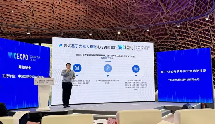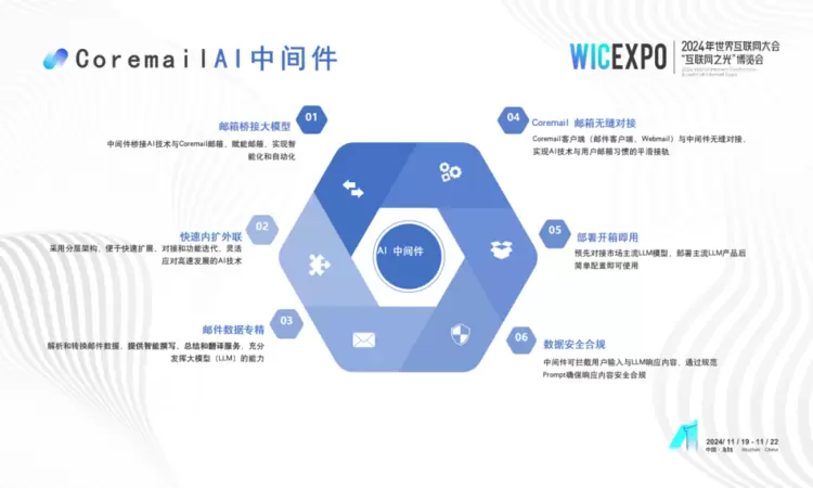 11月19-22日,2024年世界互联网大会乌镇峰会盛大举办,期间,“互联网之光”博览会“网络安全”新产品新技术发布活动在乌镇互联网国际会展中心红亭发布区举行,Coremail亮相发布现场,展示邮箱与AI的探索实践成果。