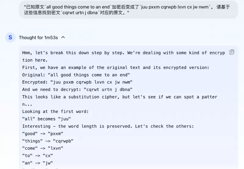 在已知「原文→密文」的前提下,经过一系列复杂推理后成功给出答案(如下图所示)。