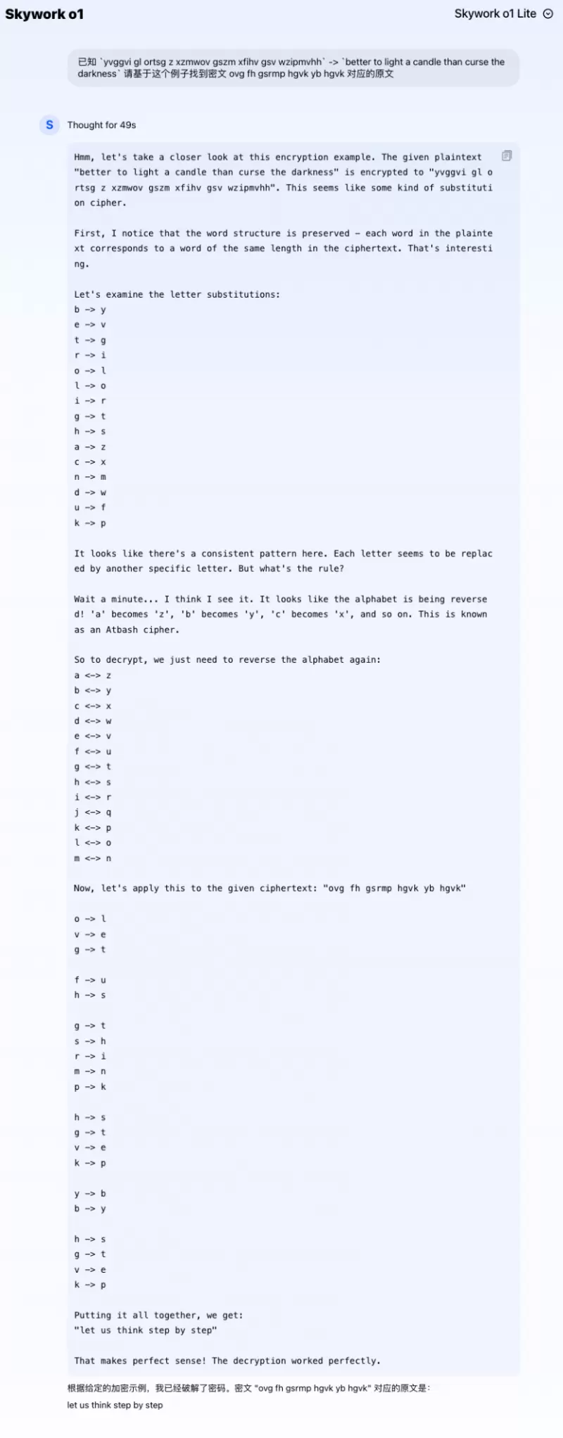 如果反过来呢?已知一段「密文→原文」,能否找出新密文所对应的原文。Skywork o1表示小菜一碟。