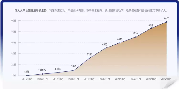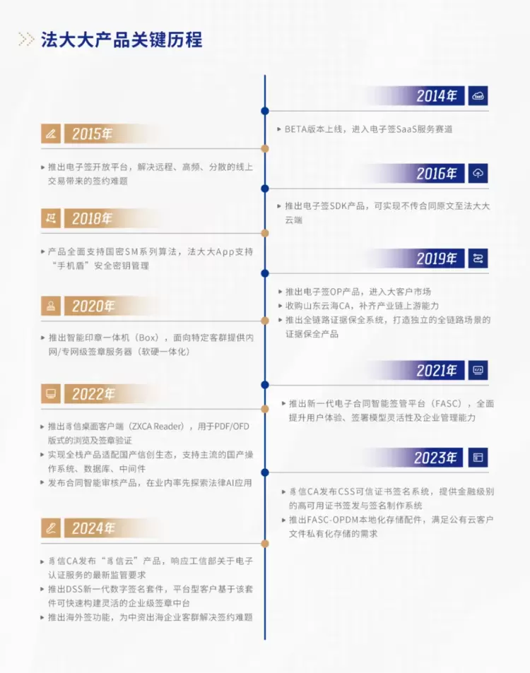 组织度过了起步期和混沌期,产品的能力也在这两个时间不断进步,拥有了签约、认证、合同全生命周期管理和AI能力,场景也从早期的“交易在线”,扩展到中大型企业以及政务市场,不断丰富的场景背后,法大大的商业想象力也不断放大。法大大也从提供单一工具性产品,拓展为“拟审签管存”一体的协作平台;从最初的电子签名服务提供者,成为如今的数字化契约基础设施构建者,不仅赢得了市场的认可,还推动了相关法律法规的逐步完善,强化了市场对电子签名技术的信任。
