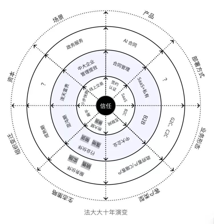 在采访黄翔之前,我在纸上画了三个同心圆,想以场景为核心来看法大大这十年成长的变化,然而和他聊完之后,我发现我的想法草率了。用三个同心圆不仅可以表达法大大的场景变迁,同时也可以表达法大大产品、资本、组织、生态、客户类型、业务形态、部署方式等几个方面的演进过程,这可能更能全面地透视法大大这十年。