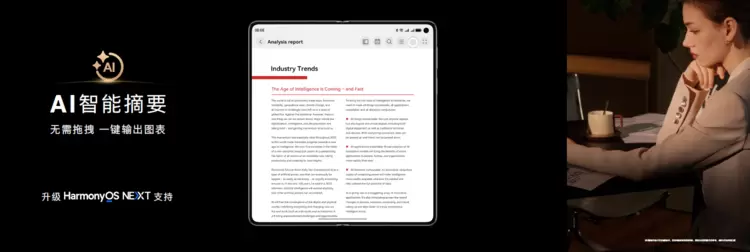 软件生态建设可以说是折叠屏手机成功的关键所在,HUAWEI Mate X6为用户带来更自由便捷的分屏、更强大的手势操作,在与HarmonyOS NEXT的完美结合下,持续为用户提供更有趣的交互体验。鸿蒙原生智能赋能三方应用,此次小艺也针对HUAWEI Mate X6大屏进行了适配,当用户在看钉钉文档时,可通过小艺一键生成文档摘要和问答;在搜狐新闻上浏览资讯时,可让小艺快速输出摘要;同时小艺智能扩写润色功能也已经接入微博APP,用户在微博发布框内输入文案初稿,小艺即可根据不同场合输出轻松、文艺或正式等不同风格文案,让内容创作变得更轻松!