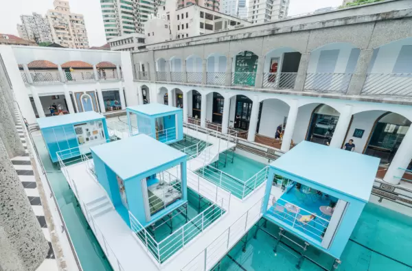 老洋房一直是上海最具看点的历史建筑,而此次上海水屋的最大亮点正是在拥有百年历史的海军俱乐部泳池内,搭建出一个位于泳池水中央的美学体验馆。当人们通过悬空步道进入水屋,在水面倒影与治愈系蓝色主题屋的互相映衬下,仿佛踏入一个不可思议的奇幻空间。