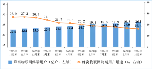 11月28日消息,根据工信部昨日公布的《2024年前10个月通信业经济运行情况》显示,截至2024年10月末,三家基础电信企业发展蜂窝物联网终端用户26.25亿户,比上年末净增2.93亿户。IPTV(网络电视)总用户数达4.07亿户,比上年末净增592.1万户。