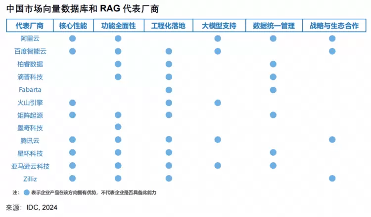 在分析了RAG和向量数据库市场的发展趋势后,IDC还评估了市场上的主要厂商。在这一评估中,百度智能云的向量数据库VectorDB在核心性能、功能全面性、大模型支持、战略与生态合作、工程化落地五个关键领域保持领先,综合排名并列第一。
