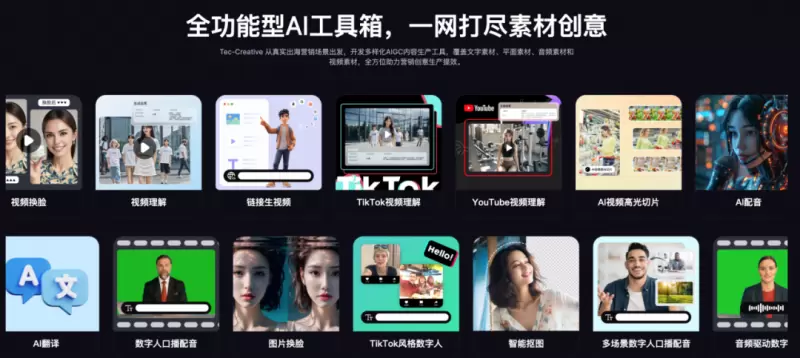 依托强大的底层模型能力和出海深度洞察数据,Tec-Creative 2.0希望独树一帜地实现AIGC“功能大集成”,让爆款能够“一键”实现。最新上线的Tec-Creative 2.0拥有超过15款AIGC功能,覆盖文字素材、平面素材、音频素材和视频素材等,紧密贴合行业需求的同时,几乎覆盖所有海外营销素材生成场景,一网打尽素材创意,真正实现“一键爆款”。