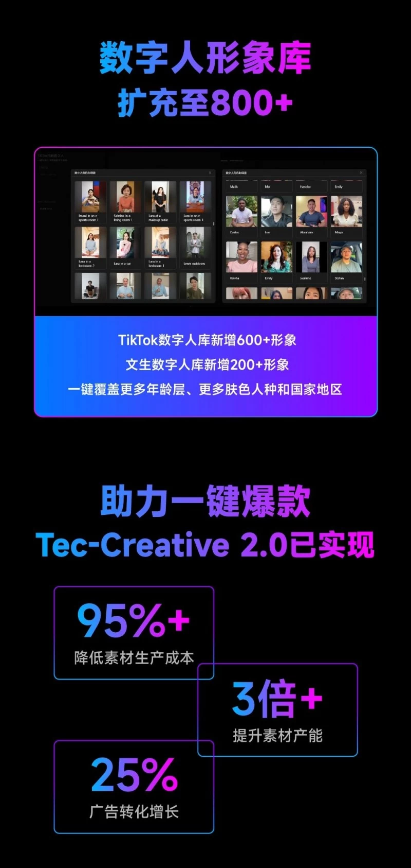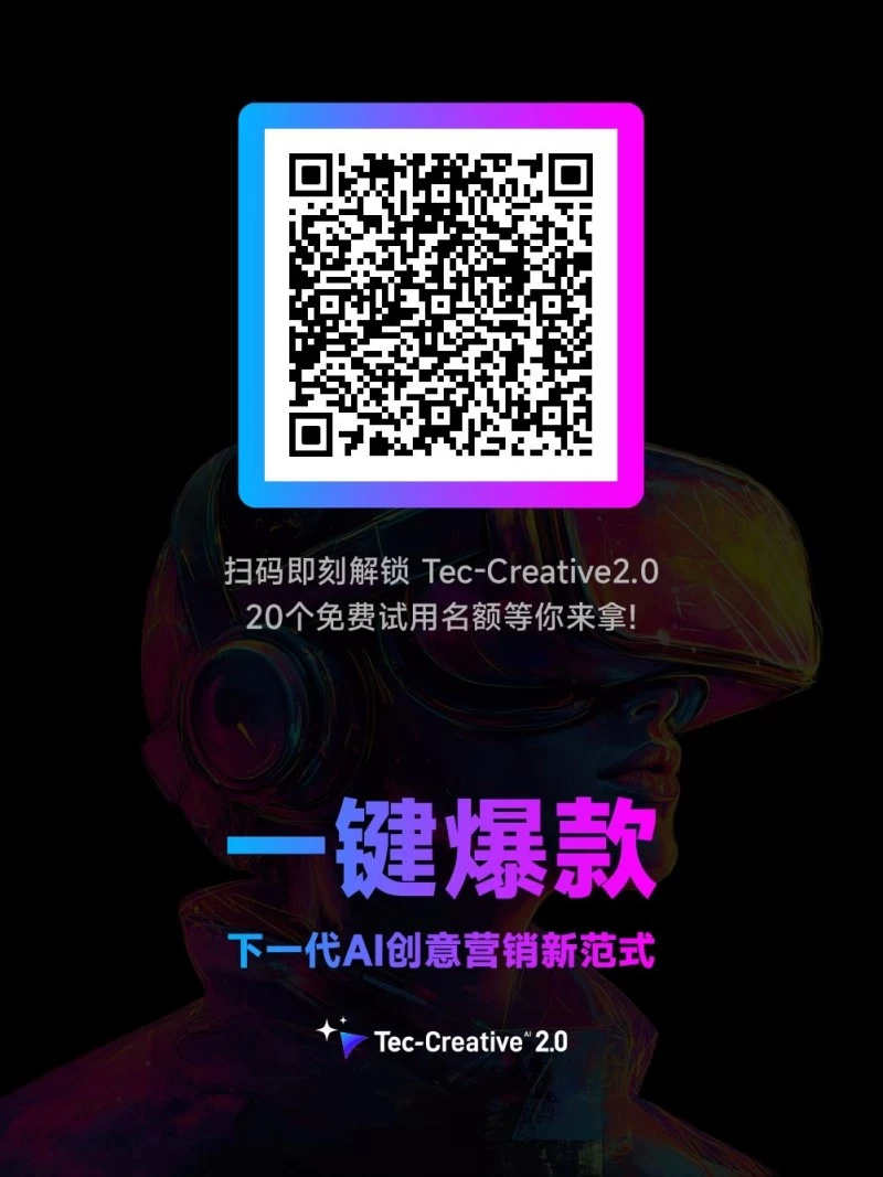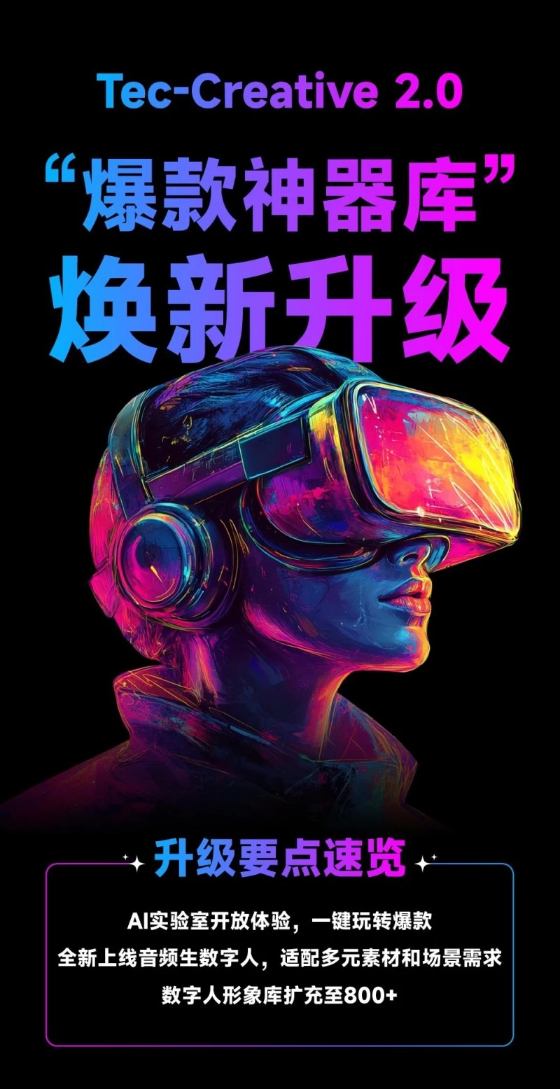 “一键爆款”最强武器Tec-Creative 2.0今年10月正式上线,一系列AIGC素材生成功能覆盖出海多场景多需求,帮助企业快速、高效地创作爆款营销创意。此次更新版本中,Tec-Creative 2.0的超能力“武器库”再度上新:全新上线AI实验室,开放体验音色克隆、图片生成数字人和唇形一致等趣味能力;上线音频生数字人功能;同时数字人形象库已扩充至800+。
