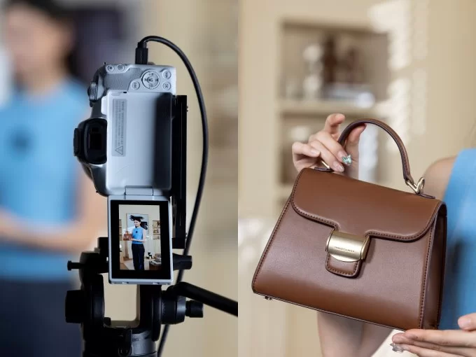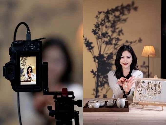 在低成本实景直播间中,建议使用佳能 EOS R50。EOS R50具备高画质表现,能够精准呈现人物和产品的色彩与质感。搭配RF-S18-45mm F4.5-6.3 IS STM变焦镜头,人物变形更小的同时,一定程度上压缩空间,既避免了房间的杂乱感,又增强了画面的层次感,让主体人物更加突出,整体画面更具电影感、高级感。