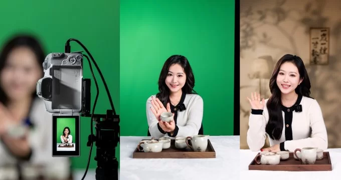 绿幕背景(左图和中图)和用户端输出效果(右图),使用EOS R50直播绿幕抠像人物边缘更加清晰