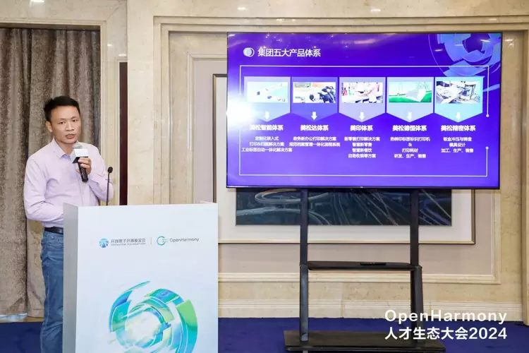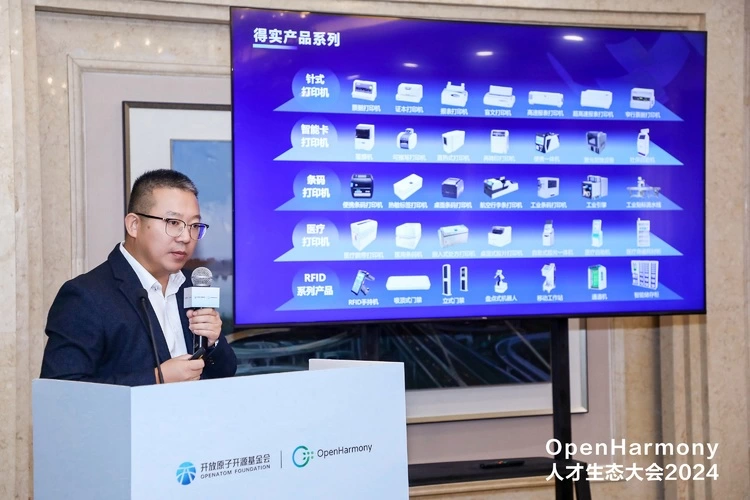 得实打印机(江门)有限公司的总经理马永刚分享了公司与OpenHarmony的结缘之路,以及在PC端基于LightBeeOS工业主机的条码机、智能卡机系列产品的适配和移动端的各类卡机的适配。