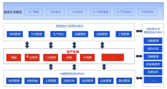 以SRM系统促进与供应商的更紧密合作,通过MES系统采集现场作业数据(如:实际工时、易错工序等)反馈工艺部门,促使设计生产一体化,通过WMS系统清晰掌握物料及零部件库存数量、状态,让管理部门决策更有效。