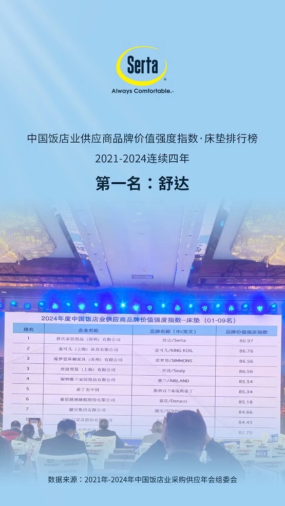 在谈到此次再度夺冠时,舒达酒店与大客户部总监杜杰表示:“我们非常荣幸能够连续四年蝉联第一。舒达将继续保持‘Always Comfortable’初心,不断创新和完善产品,为酒店客户带来非一般的舒适体验。”