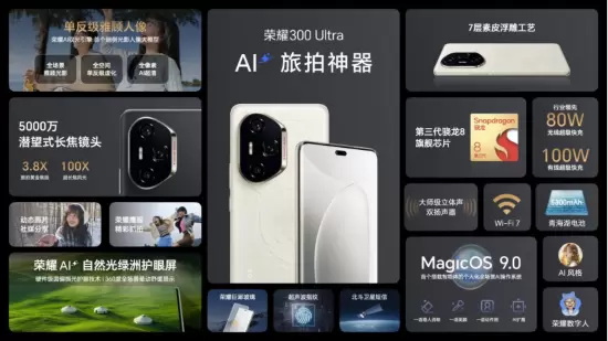 荣耀300系列以“5000万超清长焦+荣耀AI驭光引擎”的超强组合,打造全焦段、全场景AI旅拍神器;搭载历代最强的荣耀AI自然光绿洲护眼屏,实现屏幕护眼技术的巨大跨越;第三代骁龙8处理器领衔全域冷驱散热、青海湖电池等旗舰级配置,卓越性能领跑同档;MagicOS 9.0操作系统带来智慧功能的全面升级,持续引领手机自动驾驶时代;外观设计方面,新国风配色和旷野舷窗的设计理念,将中国自然风光与旅行元素巧妙融入轻薄机身,全方位缔造最强大、最智慧、最具辨识度的荣耀数字系列。