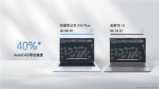 作为荣耀笔记本X Plus系列的全新力作,荣耀笔记本 X14 Plus 2025和X16 Plus 2025全系首批搭载酷睿第2代英特尔® 酷睿™ 5处理器,采用intel7工艺,最高为12核16线程,最大加速时钟频率可达4.9GHz,整机最高性能释放分别为40W和45W。值得一提的是,在Auto CAD的导出测试中,荣耀笔记本X Plus系列2025表现显著优于友商,速度提升高达40%。