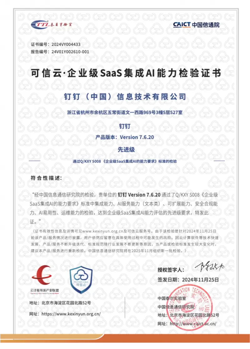 12月3日,在2024全球数字经济大会上,中国信通院揭晓首批可信AI云评估结果,钉钉获评“企业级SaaS集成AI能力评估”的“先进级”认证。这是该标准认证的最高评级,钉钉也成为目前国内唯一一家通过认证的AI应用。