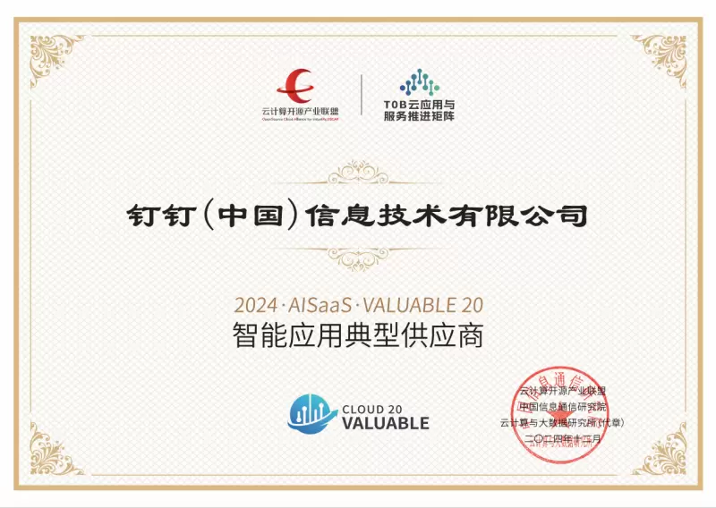 该奖项由云计算开源联盟、To云应用与服务推进矩阵发起,分别面向集成了AI能力的SaaS服务和解决方案提供商、AI原生应用开发和服务商等。钉钉在智能应用的AI技术成熟性、运营水平领先性、战略创新性以及应用成效评价四大维度上,综合评估领先,成功入选该评估。