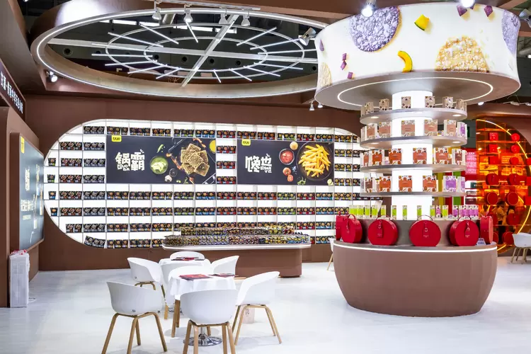 今年,甘源食品隆重推出健康黑巧子品牌——“果果嘿巧”及3大全新膨化子品牌系列——“锅霸”“馋也”“谷维能”。展馆达到了往届两倍之大,共448㎡,以品质棕色和奢华金色为主色调,结合动态光影,打造了一个集轻奢艺术与美食为一体的沉浸式空间,为逛展顾客带来一场来自甘源的奇遇。