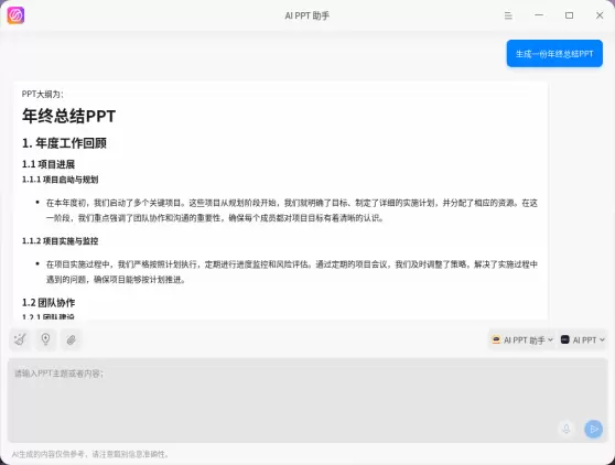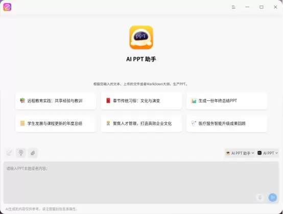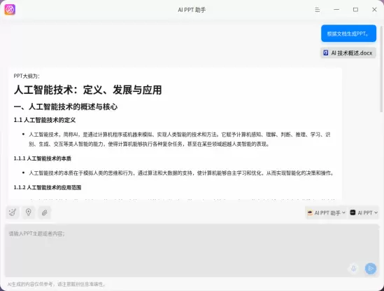 AI PPT助手智能体拥有丰富多样的模板和布局样式,适应不同内容场景。其核心功能包括主题生成PPT、文档生成PPT以及智能排版和编辑等。用户只需输入主题或上传Word、PDF、Xmind等文档,AI PPT助手即可快速生成专业水准的PPT,极大地简化了繁琐的手动操作。