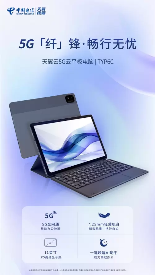 在云电脑技术的前沿探索中,天翼终端再次迈出重要步伐,匠心打造首款自研5G云平板——天翼云5G云平板电脑TYP6C,这款平板集日常办公与休闲娱乐于一身,一键操作即可轻松切换“工作”与“生活”模式。其采用太空灰金属机身设计,7.25mm超薄厚度轻巧便携,出行、居家都能轻松应对。支持5G全网通,无论是移动办公还是追剧刷视频,都能畅享极速网络体验。标配超薄磁吸键盘即插即用,让文档撰写、记事记录、社交聊天等都能轻松“敲”定。此外,天翼云平板电脑还搭载了自研操作系统,深度适配天翼云电脑解决方案,多种方式一键启动云电脑。同时,云端AI助手将智能办公推向新高度。支持文本翻译、法律问答、会议助手等AI技能,让工作更便捷。