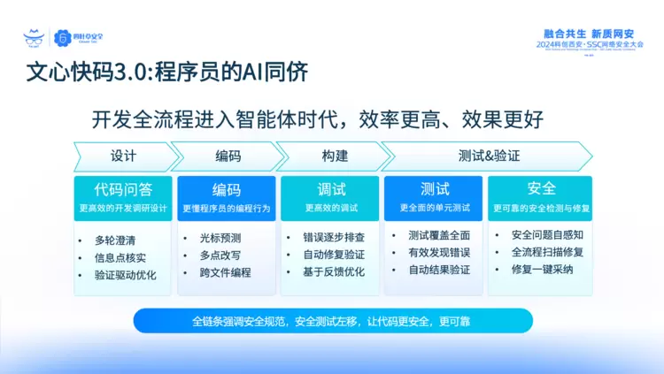 具体而言,在研发需求阶段,文心快码通过需求澄清引入安全设计,保障安全规范落地;在调研阶段,通过模块梳理和代码解释,工程师可在短时间内深入理解项目和代码的架构逻辑,迅速识别存在的安全逻辑漏洞并一键修复,此外,自动生成流程图模式也进一步提升了这一阶段的效率;在开发阶段,安全智能体的引入,让代码更安全,一方面通过安全增强模式,让AI生成代码更安全,通过敏感信息脱敏,避免数据传输过程中造成泄露,另一方面可针对工程师代码自动发现和修复漏洞;在测试阶段,通过测试智能体自动化生成单元测试,确保研发质量和安全;在发布阶段,通过流程安全管控,保障线上业务安全。此外,不仅是研发阶段,文心快码在安全运营阶段也能大幅提升效率。