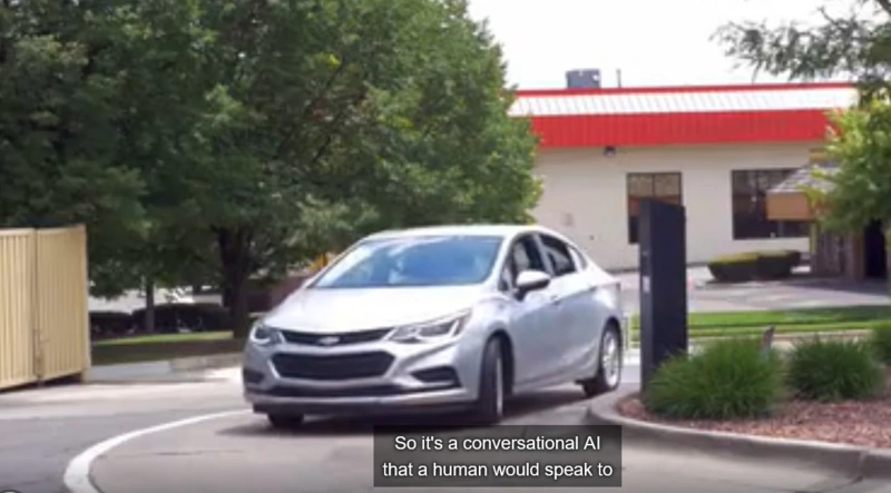 汽车餐厅的顾客正在与Clinc人工智能对话 (AI镶嵌在黑色立柱中)