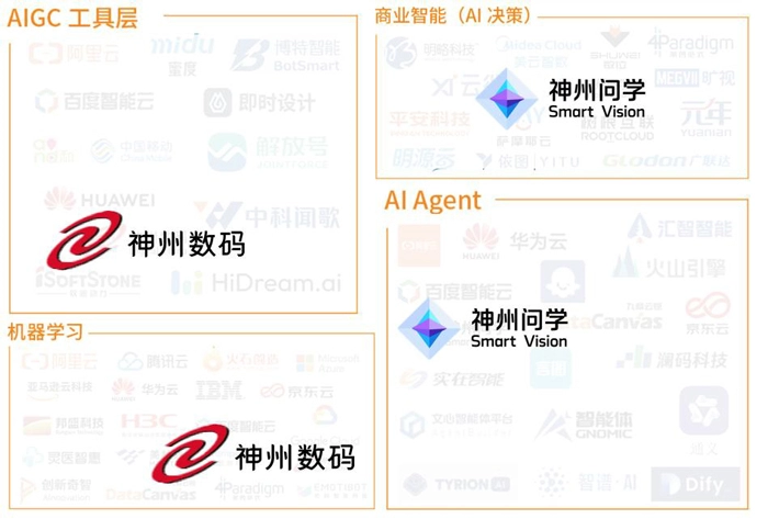 此外,在由神州数码联合发布的《中国数字技术新力量图谱(第四版)》中,神州数码及旗下神州问学、神州鲲泰共进入“AI Agent”、“AIGC工具层”、“商业智能(AI决策)”、“服务器”、“云平台”等十个重点板块,相较往年覆盖范围显著扩大,充分展现神州数码全栈能力的持续提升以及在多领域的突破。