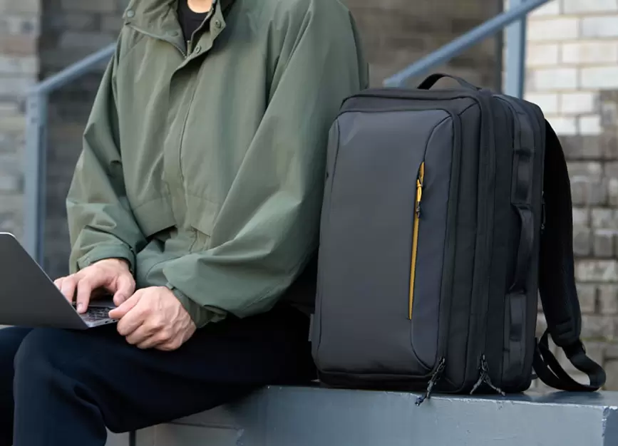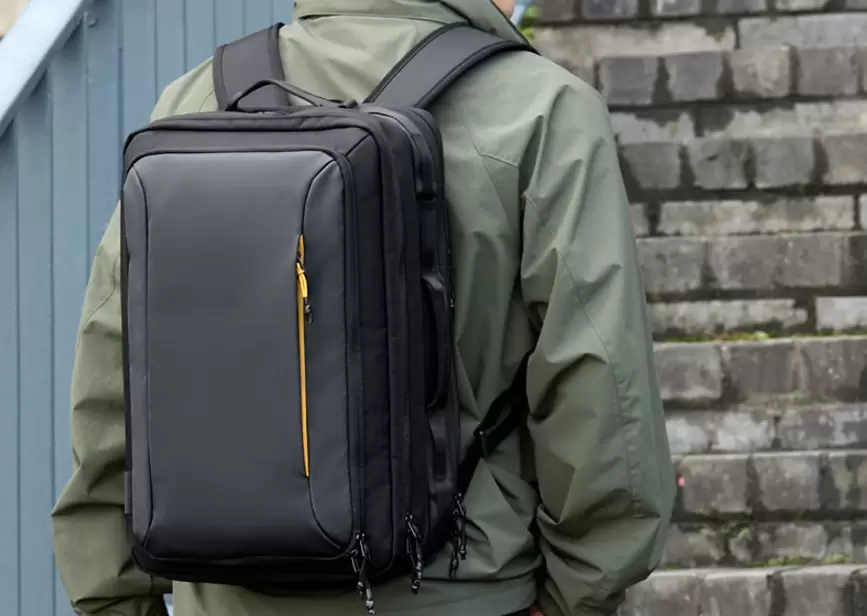 这款包有三种背负模式可相互切换,首先是方便差旅出行的竖背模式,属于常规通勤的双肩背包形态。
