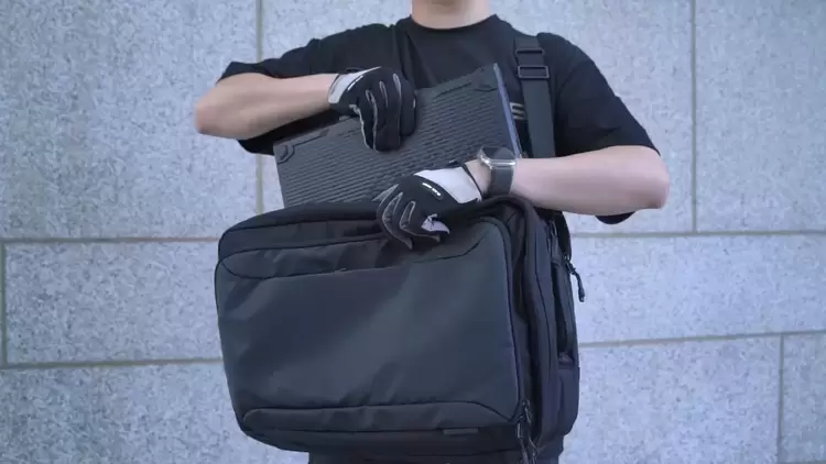 包体自带可扩容设计,满载容积来到35L,支持17英寸笔电并有专门的笔电仓位。
