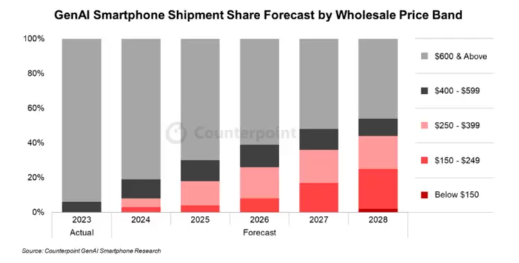 根据Counterpoint的市场数据分析,生成式AI智能手机的市场正向高价位区间快速迁移。2023年至2028年,售价在600美元及以上的设备市场份额将显著增长,而低于150美元的低端设备占比持续萎缩。