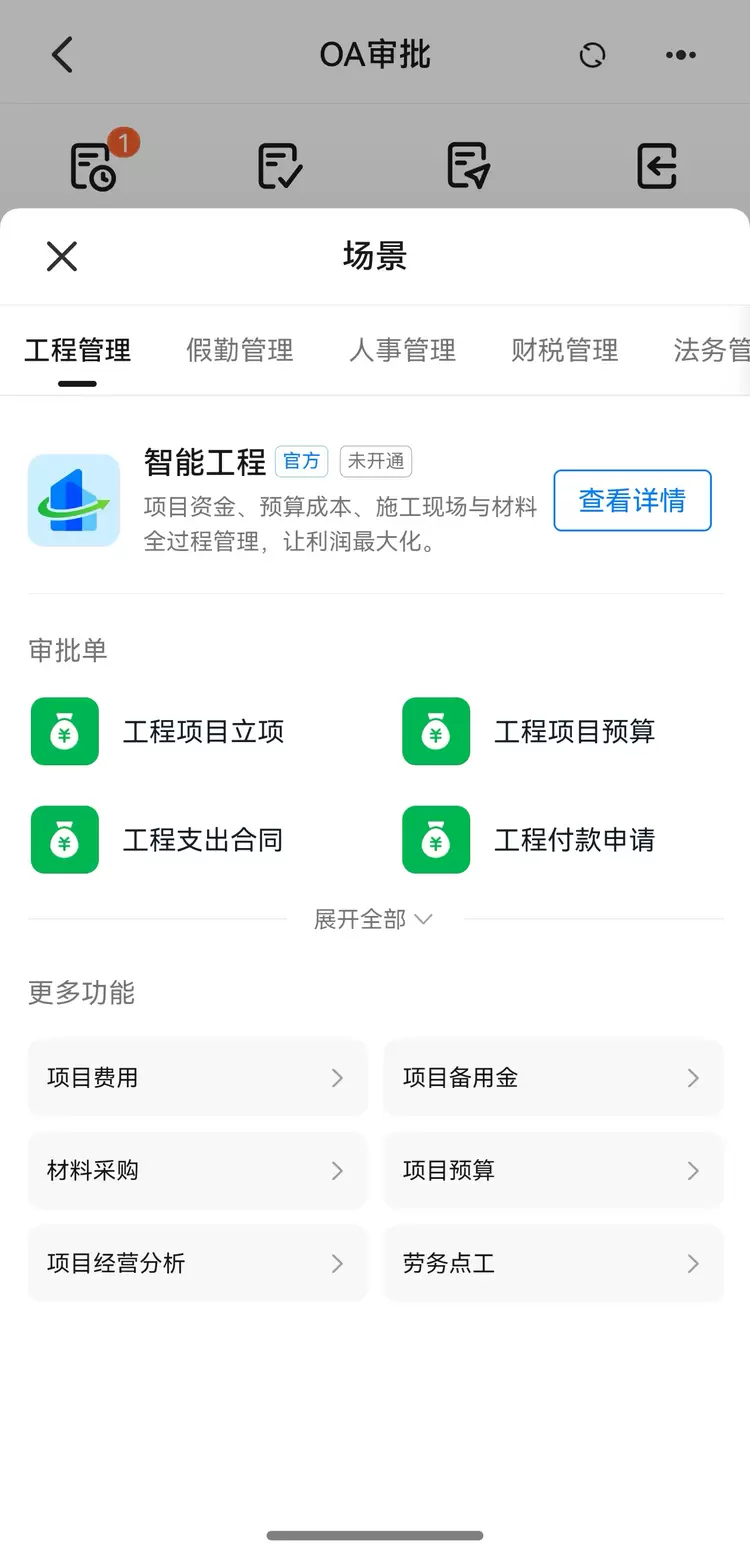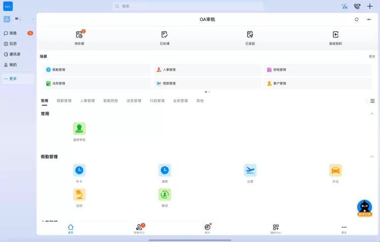 经实测发现,最新版本的OA审批功能已相当完善,组织内成员的假勤管理、人事管理、智能财务、法务管理、行政管理、业务管理等类别的审批事项,都可以在线上完成。大家可以在钉钉主界面“更多”入口里找到“审批”入口,快速提交审批事项,审批人也能直接在工作通知中查看并快速同意审批事项。鸿蒙原生版钉钉还预置了丰富的OA审批场景,比如智能差旅、资产采购、日常报销、工程项目立项等等,“开箱即用”,非常方便。