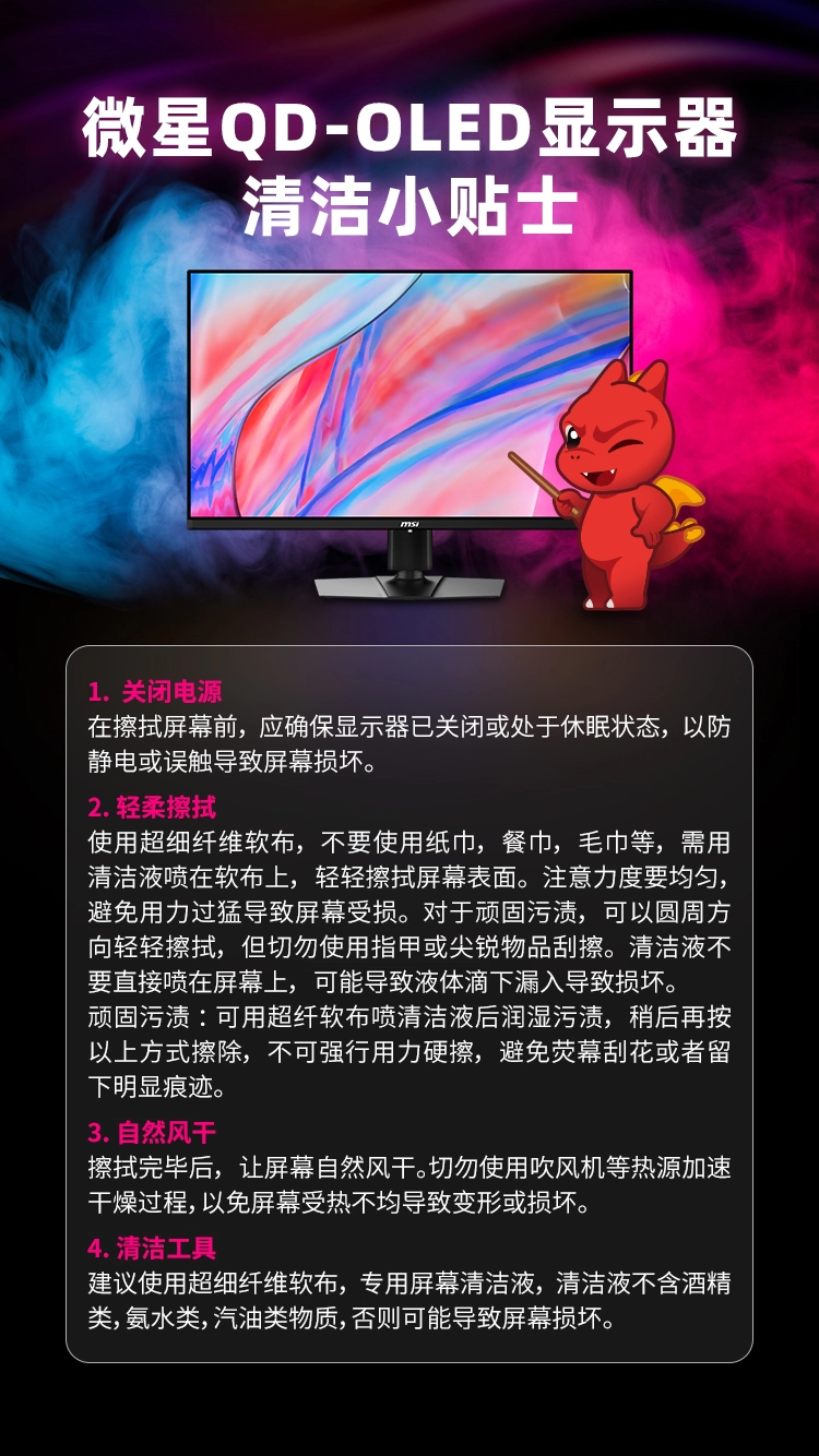 随着QD-OLED技术的日益成熟,微星旗下的QD-OLED显示器以其出色的色彩表现、高对比度和超宽视角,赢得了市场的广泛好评。为了确保用户能够长期享受到优质的视觉体验,微星特别强调了正确的屏幕清洁方法,以避免不当操作可能导致的屏幕损伤。