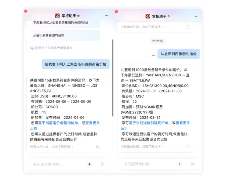 环世物流也引入了钉钉AI 的能力,对自有 ERP 系统进行了智能化改造。依托钉钉 AI, 环世物流整合了体系内上千家国际物流企业和船舶公司的数据,提供最新实时的航运物流报价,并通过 AI 助理进行定制化和即时回复。面对客户询价,销售人员只需向 AI 助理简单询问,便可在海量数据中迅速匹配到精准的航运价格,自动生成可一键分享的个性化报价单,彻底改变以往的手动报价模式,实现报价效率与客户体验的双重提升。