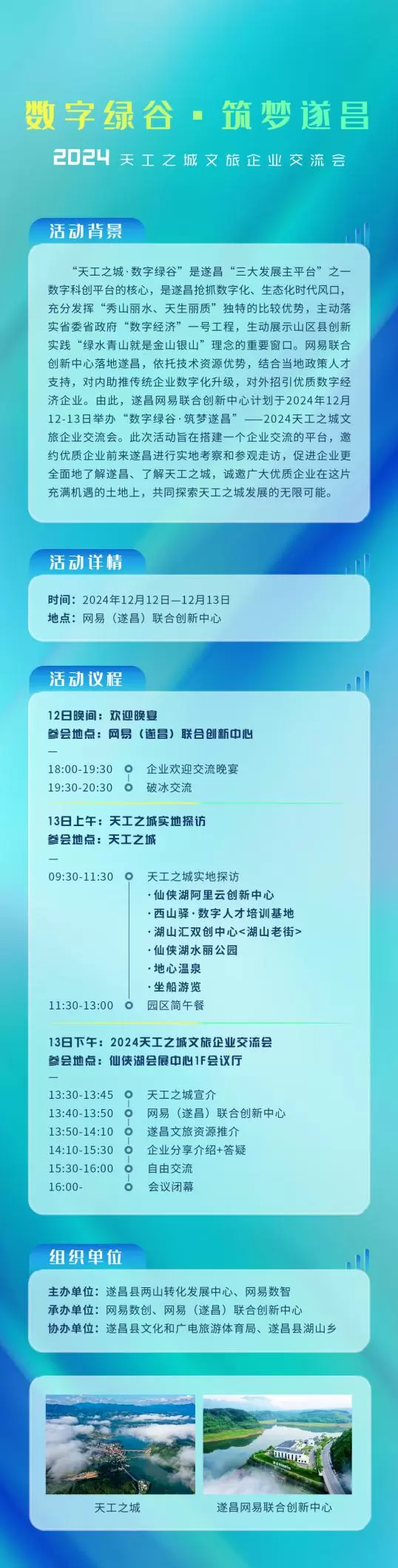 “数字绿谷·筑梦遂昌”2024天工之城文旅企业交流会,将于12月13日在网易(遂昌)联合创新中心举办。本次活动由遂昌县两山转化发展中心、网易数智主办,网易数创、网易(遂昌)联合创新中心承办,遂昌县文化和广电旅游体育局、遂昌县湖山乡协办。旨在搭建一个面对面的企业交流平台,诚邀各界精英亲临天工之城,实地考察遂昌的独特魅力与发展潜力,探讨合作机遇,共绘文旅产业发展蓝图。