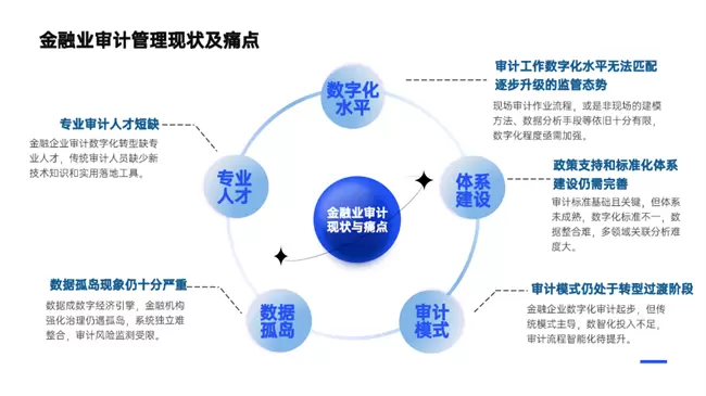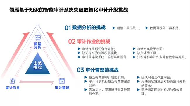 第二,审计作业痛点。一是审计作业形式有待完善,很多机构在已构建数字化审计系统的情况下,日常审计工作仍习惯于现场、线下开展,导致线上、线下工作完全割裂;二是缺乏标准的知识积累模块,导致前期审计步骤及经验无法形成标准化积累,难以有效复用;三是审计程序缺乏统一的标准和规范,不同的项目和审计团队往往采用不同的审计流程和操作方法,导致审计结果存在较大的差异和不确定性,这种不一致性不仅使得审计结果难以相互比较和验证,也增加了审计工作的复杂性和风险,导致无法有效地进行后续统计分析及领导决策;四是审计方案流于表面,编制方案时往往仅是基于先前其他项目方案略加改动,缺乏规范的逻辑,方案流于形式,对实际审计工作缺乏指导性;五是缺少辅助工具,传统审计作业在具体执行过程中,从计划的制定、方案的编制到报告的生成,再到审计过程中发现可疑情况,多依靠线下人工操作完成,亟需智能化的手段提升审计效率;六是知识库和审计作业结合效率待提升,在新技术飞速发展以及经济环境复杂多变的当下,如何将策略、模版、风险点等进行沉淀积累,形成可快速复用、逻辑规范、资源丰富的审计知识库,以使审计作业流程更加敏捷高效,是目前各金融机构亟待解决的一大问题。