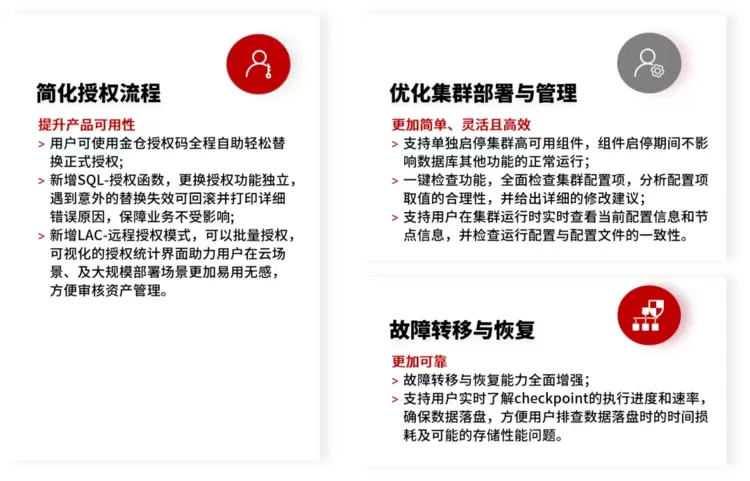 通过对软件安装配置能力的持续优化,以及对集群部署、管理、故障转移恢复以及备份还原能力的进一步完善,新版本的易用性和可用性得到了全方位的提升。