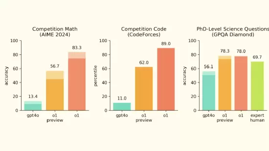 在国际数学奥林匹克预选赛题目(AIME 2024)中,o1拿到了83%的正确率,远超GPT-4o的13%,比起o1 preview的56.7%也提升了将近一半。而在编程能力测试方面,o1从GPT-4o的11%跃升到89%,同样也比o1 preview提升一半。